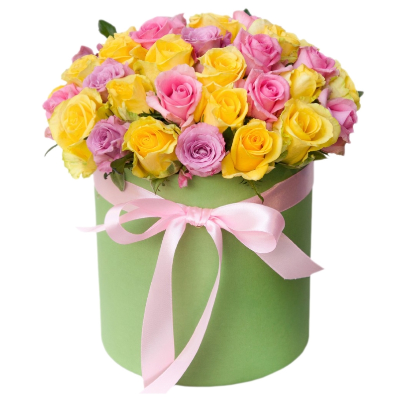 Букет состоит из 26 розовых роз, 25 желтых роз, коробка, атласная лента.