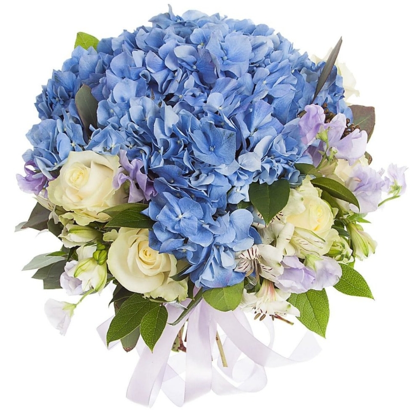 Букет состоит из 1 синяя гортензия, 7 белых роз, 4 ветки альстромерии, зелень, прозрачная упаковка, атласная лента.