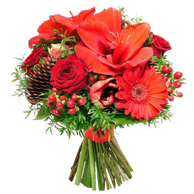 Букет состоит из 5 гербер, 9 роз, 3 амариллиса, 5 веток гиперикума, 1 альстромерия, зелень, шишки, прозрачная упаковка, атласная лента.