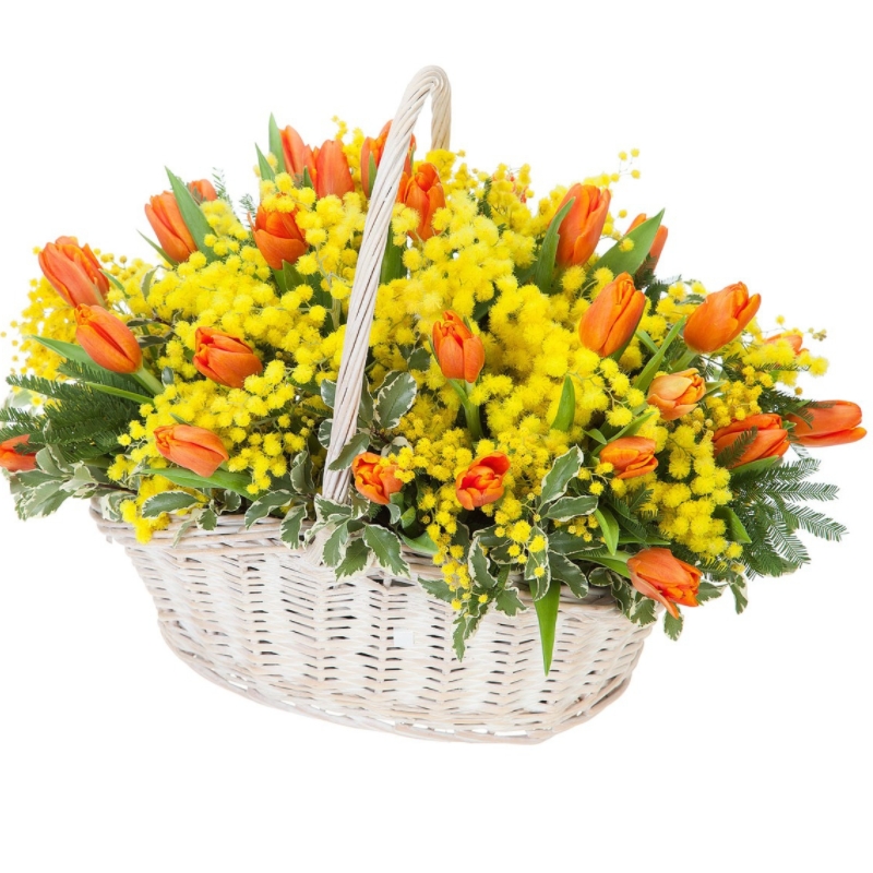 Букет состоит из 31 тюльпан, 8 веток мимозы, зелень, корзина, оазис.